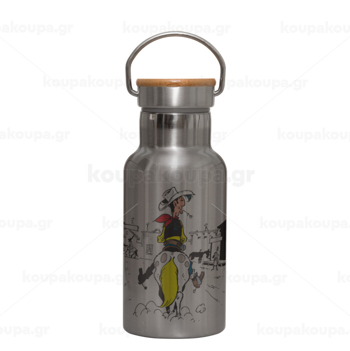 Λούκυ Λουκ comic, Μεταλλικό παγούρι θερμός (Stainless steel) Ασημένιο με ξύλινο καπακι (bamboo), διπλού τοιχώματος, 350ml