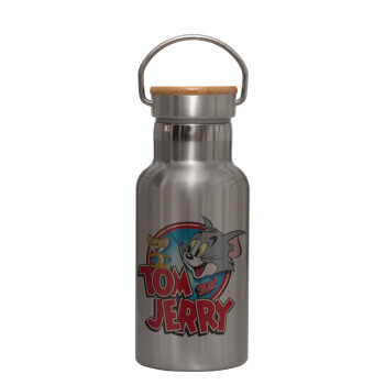 Τομ και Τζέρι, Μεταλλικό παγούρι θερμός (Stainless steel) Ασημένιο με ξύλινο καπακι (bamboo), διπλού τοιχώματος, 350ml