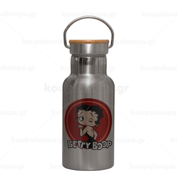 Betty Boop kiss, Μεταλλικό παγούρι θερμός (Stainless steel) Ασημένιο με ξύλινο καπακι (bamboo), διπλού τοιχώματος, 350ml