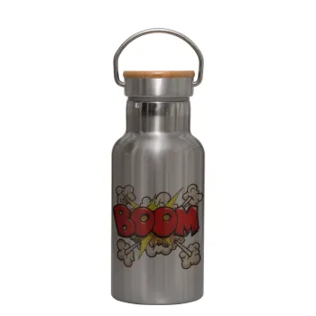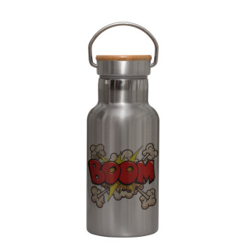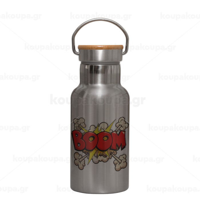 BOOM!!!, Μεταλλικό παγούρι θερμός (Stainless steel) Ασημένιο με ξύλινο καπακι (bamboo), διπλού τοιχώματος, 350ml