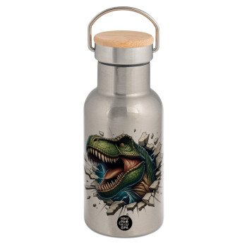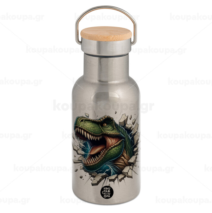 Dinosaur break wall, Μεταλλικό παγούρι θερμός (Stainless steel) Ασημένιο με ξύλινο καπακι (bamboo), διπλού τοιχώματος, 350ml