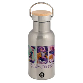 HUNTR/X K-pop girl group, Μεταλλικό παγούρι θερμός (Stainless steel) Ασημένιο με ξύλινο καπακι (bamboo), διπλού τοιχώματος, 350ml