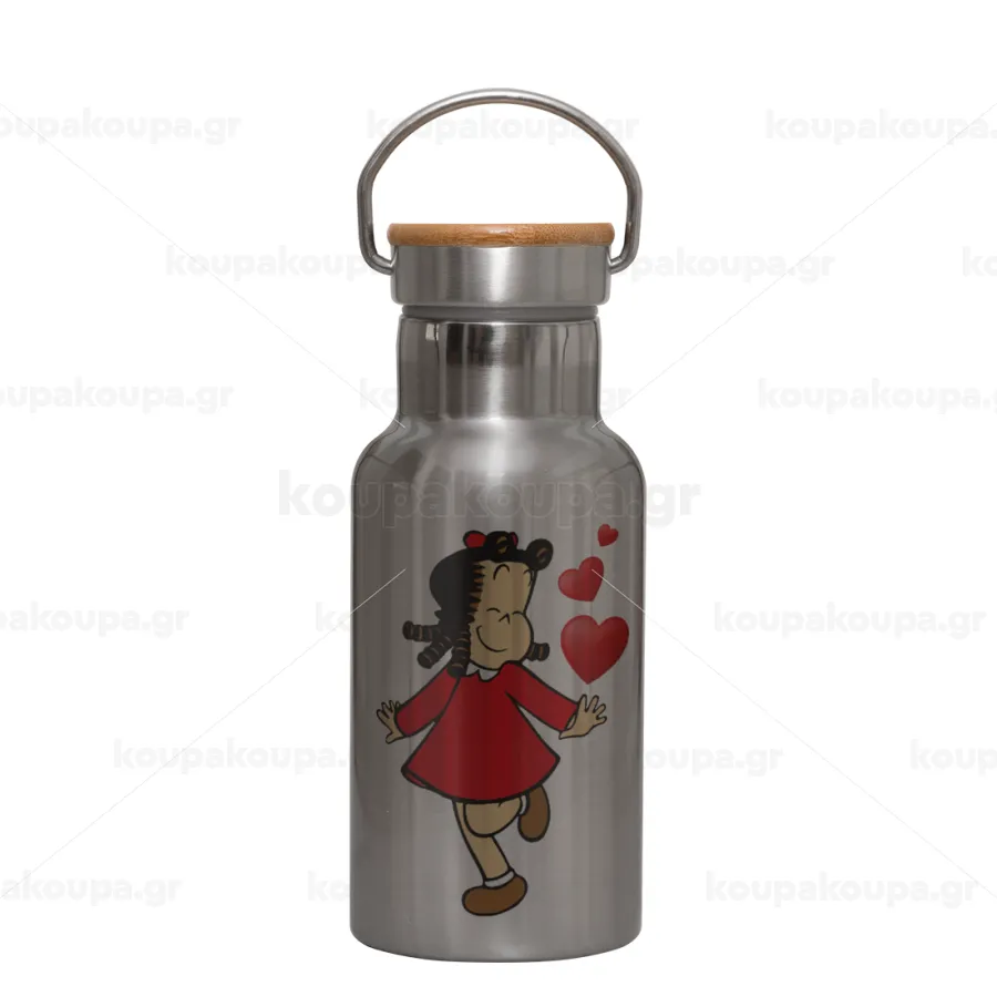 Η μικρή Λουλού, Μεταλλικό παγούρι θερμός (Stainless steel) Ασημένιο με ξύλινο καπακι (bamboo), διπλού τοιχώματος, 350ml