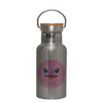 Lilo & Stitch Angel pink, Μεταλλικό παγούρι θερμός (Stainless steel) Ασημένιο με ξύλινο καπακι (bamboo), διπλού τοιχώματος, 350ml