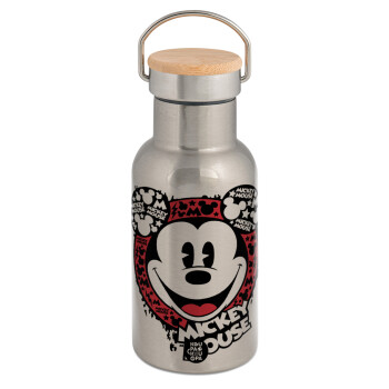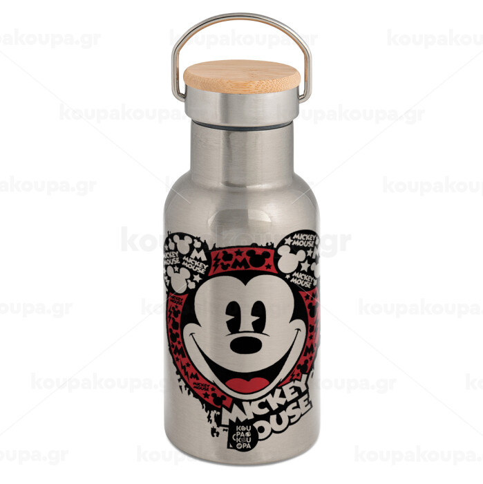 Mickey Mouse, Μεταλλικό παγούρι θερμός (Stainless steel) Ασημένιο με ξύλινο καπακι (bamboo), διπλού τοιχώματος, 350ml