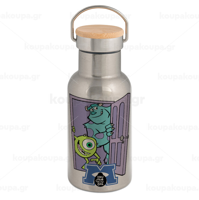 Monster inc, Μεταλλικό παγούρι θερμός (Stainless steel) Ασημένιο με ξύλινο καπακι (bamboo), διπλού τοιχώματος, 350ml