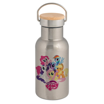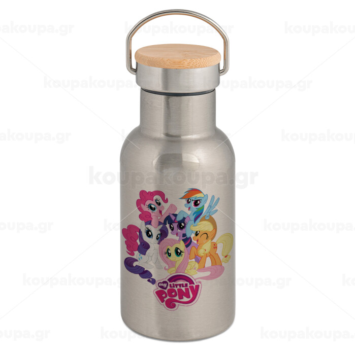 My Little Pony, Μεταλλικό παγούρι θερμός (Stainless steel) Ασημένιο με ξύλινο καπακι (bamboo), διπλού τοιχώματος, 350ml