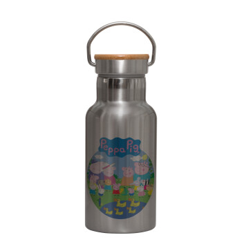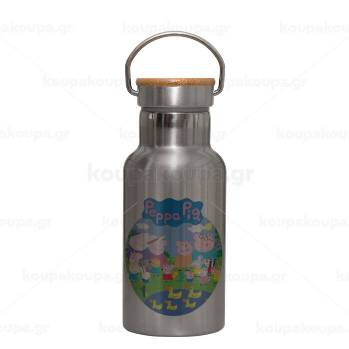 Peppa pig Family, Μεταλλικό παγούρι θερμός (Stainless steel) Ασημένιο με ξύλινο καπακι (bamboo), διπλού τοιχώματος, 350ml