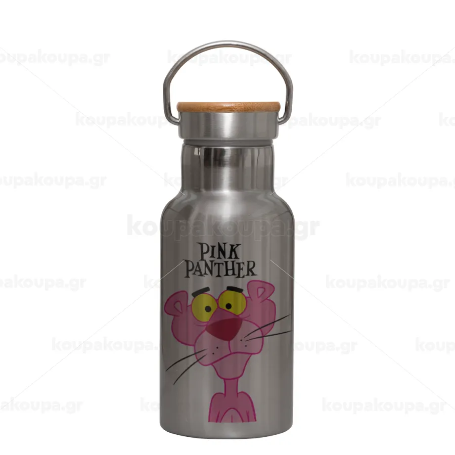 Pink Panther cartoon, Μεταλλικό παγούρι θερμός (Stainless steel) Ασημένιο με ξύλινο καπακι (bamboo), διπλού τοιχώματος, 350ml