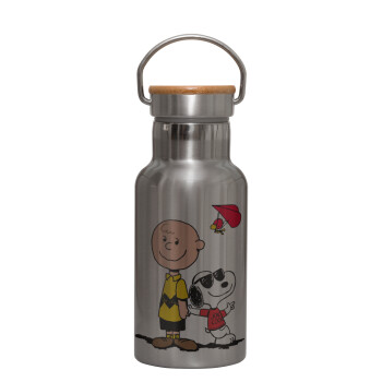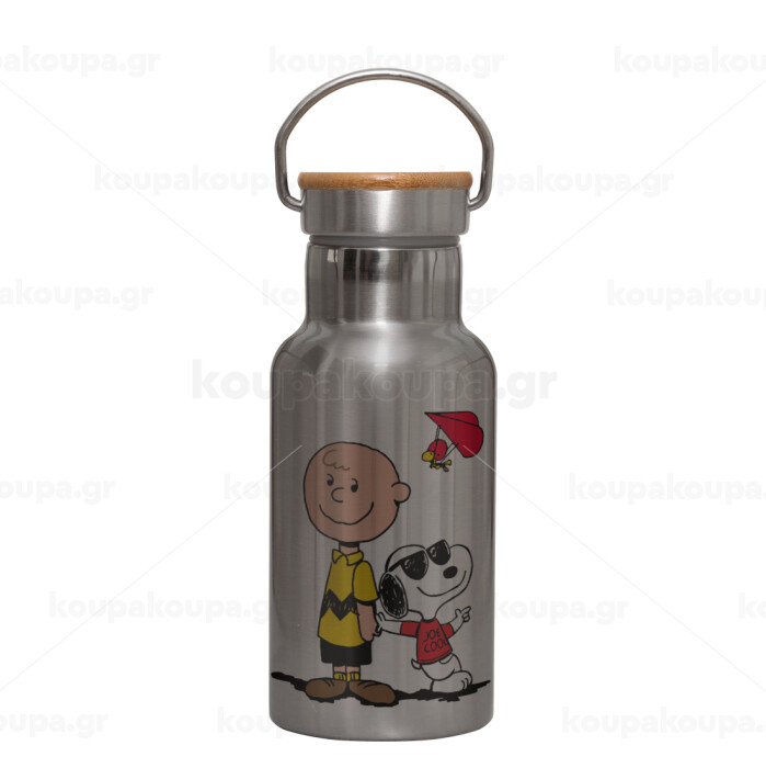 Snoopy & Joe, Μεταλλικό παγούρι θερμός (Stainless steel) Ασημένιο με ξύλινο καπακι (bamboo), διπλού τοιχώματος, 350ml