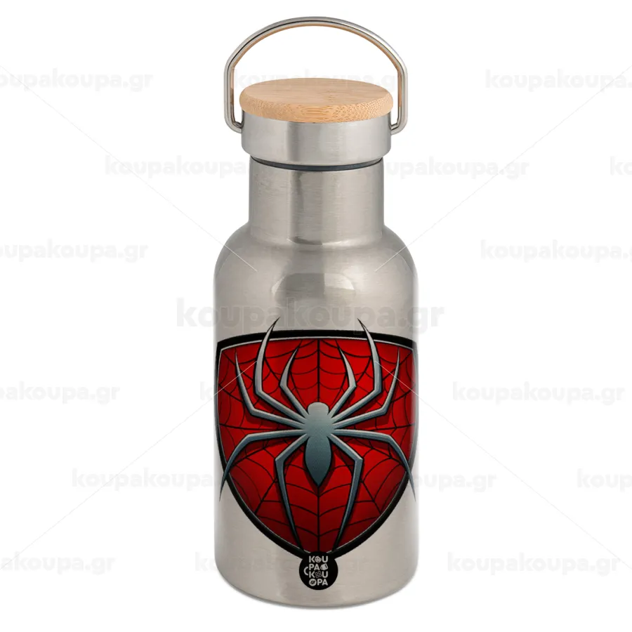 Spider-man, Μεταλλικό παγούρι θερμός (Stainless steel) Ασημένιο με ξύλινο καπακι (bamboo), διπλού τοιχώματος, 350ml