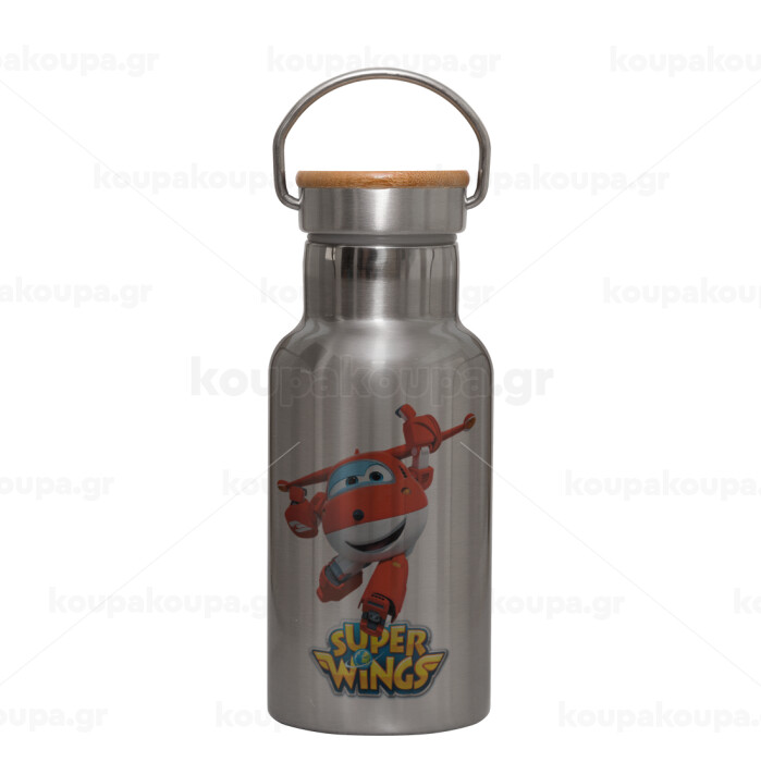 Super Wings, Μεταλλικό παγούρι θερμός (Stainless steel) Ασημένιο με ξύλινο καπακι (bamboo), διπλού τοιχώματος, 350ml
