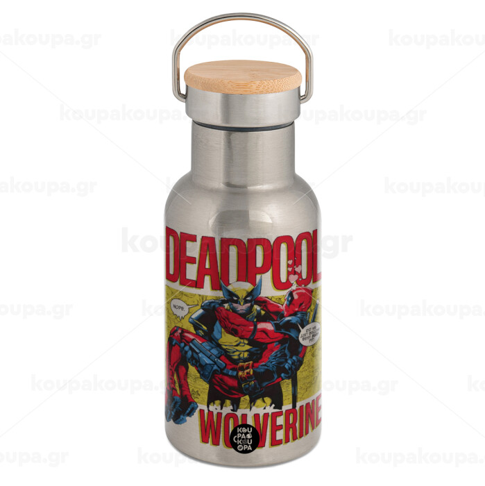 Superhero Deadpool Wolverine, Μεταλλικό παγούρι θερμός (Stainless steel) Ασημένιο με ξύλινο καπακι (bamboo), διπλού τοιχώματος, 350ml