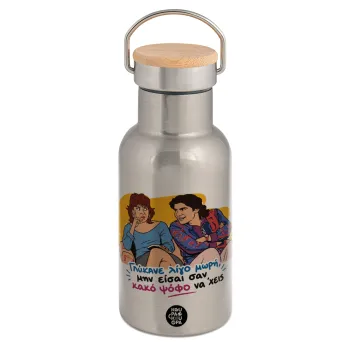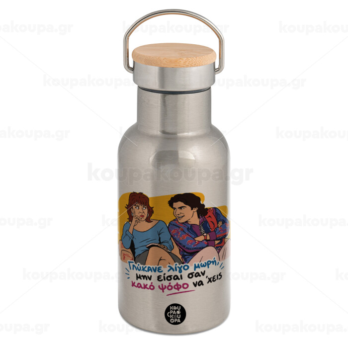Γλύκανε λίγο, Μεταλλικό παγούρι θερμός (Stainless steel) Ασημένιο με ξύλινο καπακι (bamboo), διπλού τοιχώματος, 350ml