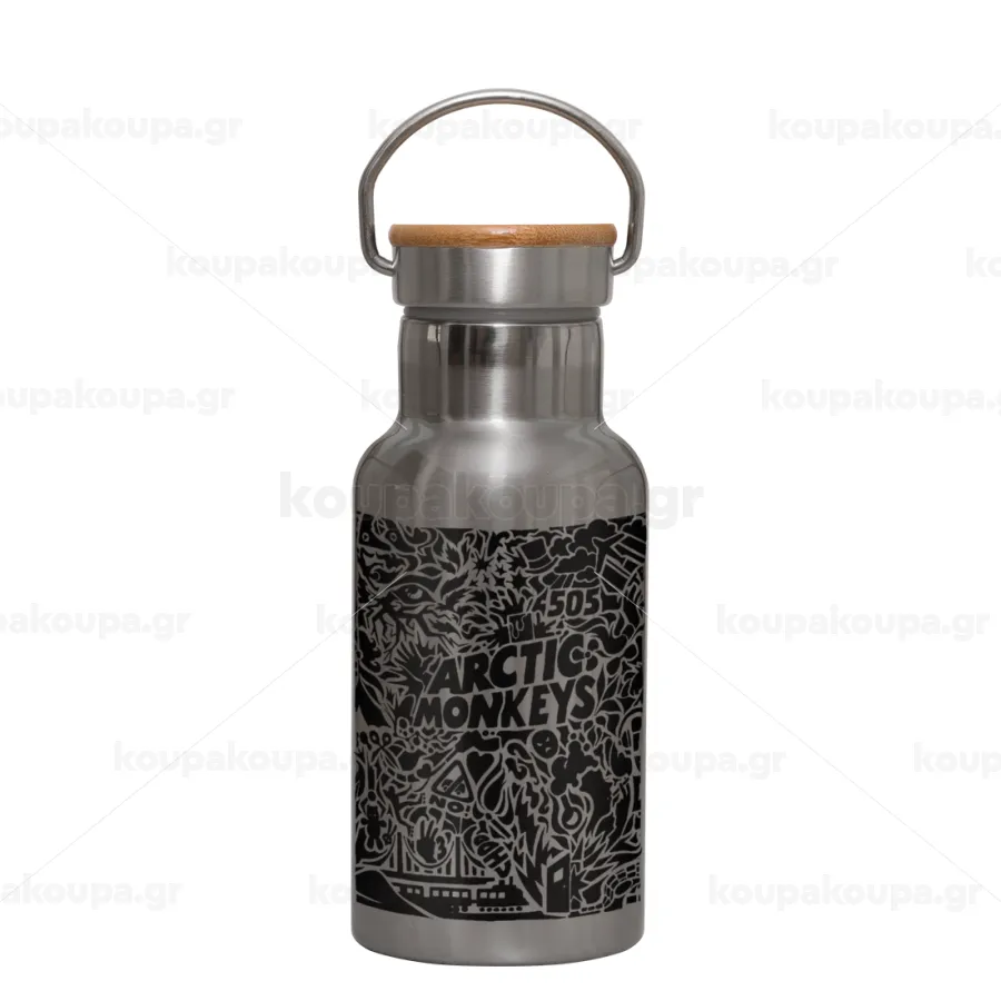 Arctic Monkeys, Μεταλλικό παγούρι θερμός (Stainless steel) Ασημένιο με ξύλινο καπακι (bamboo), διπλού τοιχώματος, 350ml