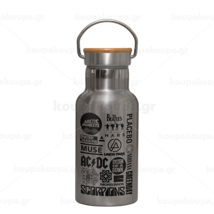 Best Rock Bands Collection, Μεταλλικό παγούρι θερμός (Stainless steel) Ασημένιο με ξύλινο καπακι (bamboo), διπλού τοιχώματος, 350ml