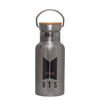 BTS, Μεταλλικό παγούρι θερμός (Stainless steel) Ασημένιο με ξύλινο καπακι (bamboo), διπλού τοιχώματος, 350ml