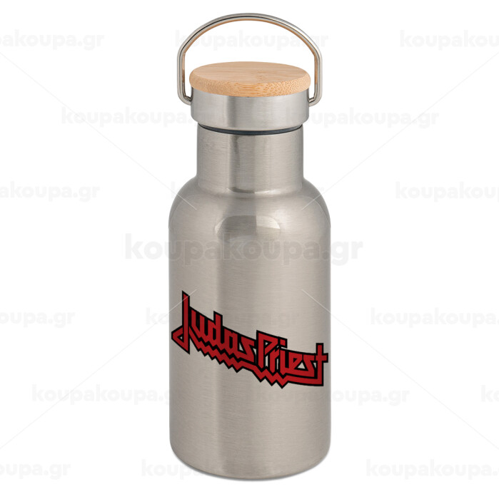Judas Priest, Μεταλλικό παγούρι θερμός (Stainless steel) Ασημένιο με ξύλινο καπακι (bamboo), διπλού τοιχώματος, 350ml