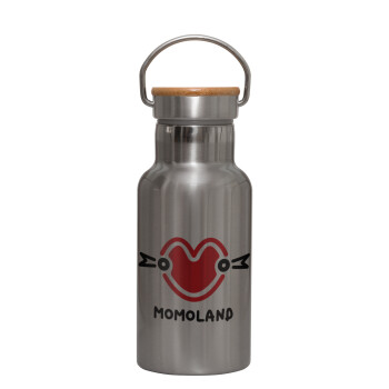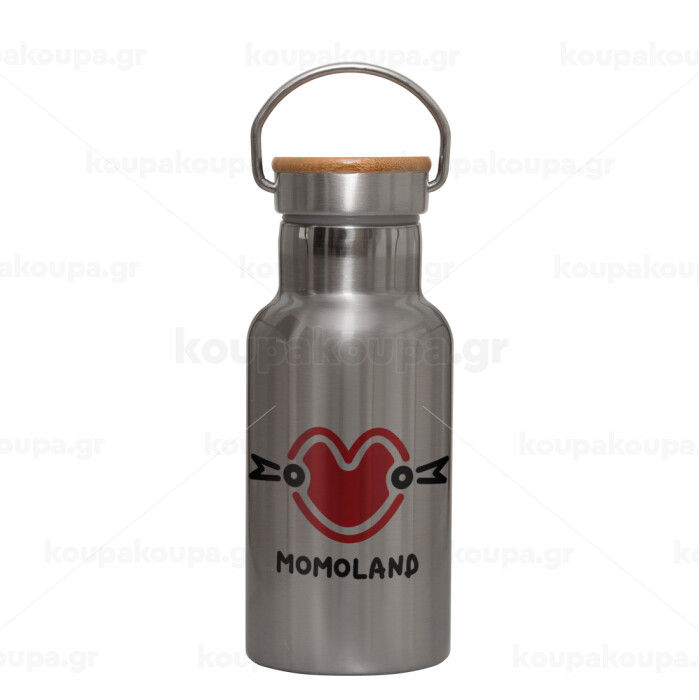 Momoland, Μεταλλικό παγούρι θερμός (Stainless steel) Ασημένιο με ξύλινο καπακι (bamboo), διπλού τοιχώματος, 350ml