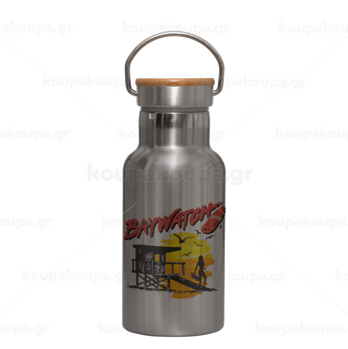 Baywatch, Μεταλλικό παγούρι θερμός (Stainless steel) Ασημένιο με ξύλινο καπακι (bamboo), διπλού τοιχώματος, 350ml