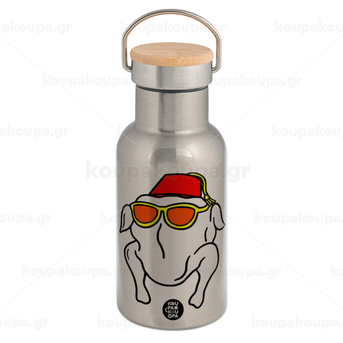 Friends turkey, Μεταλλικό παγούρι θερμός (Stainless steel) Ασημένιο με ξύλινο καπακι (bamboo), διπλού τοιχώματος, 350ml