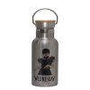 Wednesday Adams, dance with hands, Μεταλλικό παγούρι θερμός (Stainless steel) Ασημένιο με ξύλινο καπακι (bamboo), διπλού τοιχώματος, 350ml