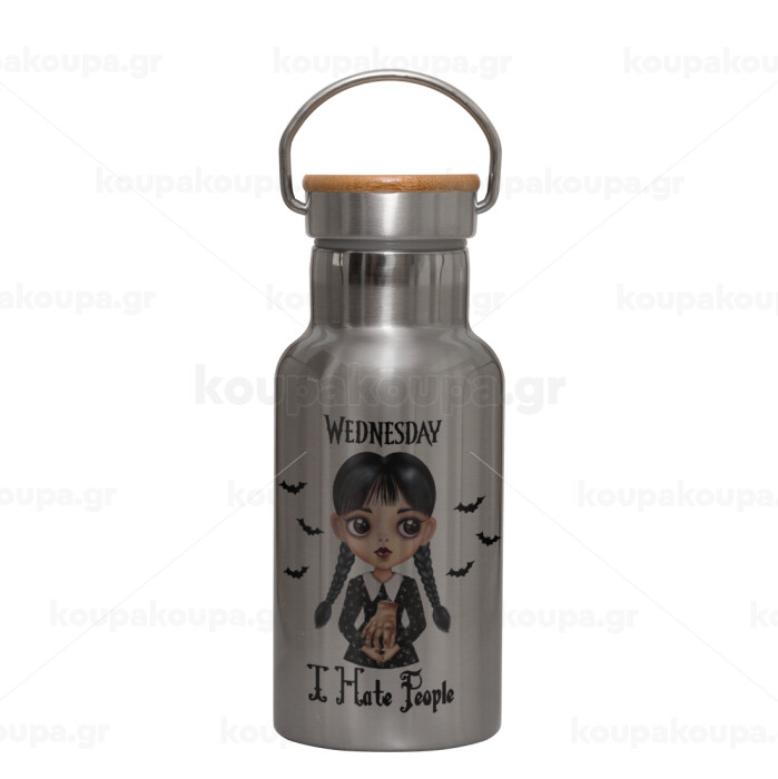 Wednesday Adams, i hate people, Μεταλλικό παγούρι θερμός (Stainless steel) Ασημένιο με ξύλινο καπακι (bamboo), διπλού τοιχώματος, 350ml