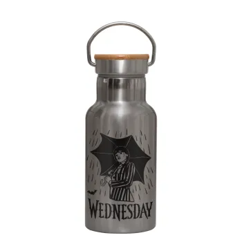 Wednesday Addams, Μεταλλικό παγούρι θερμός (Stainless steel) Ασημένιο με ξύλινο καπακι (bamboo), διπλού τοιχώματος, 350ml