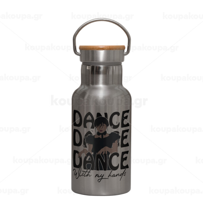 Wednesday dance dance dance, Μεταλλικό παγούρι θερμός (Stainless steel) Ασημένιο με ξύλινο καπακι (bamboo), διπλού τοιχώματος, 350ml