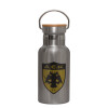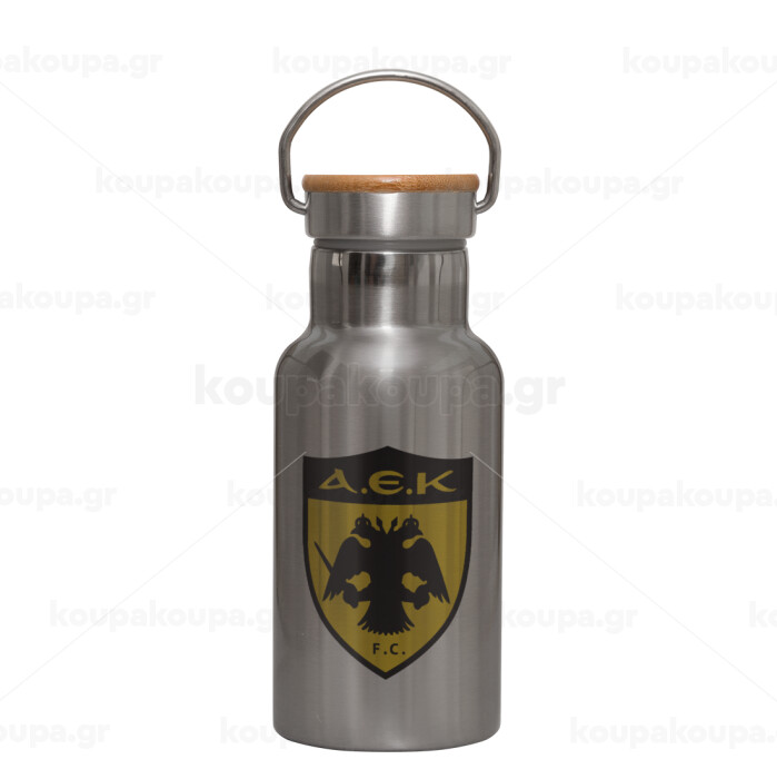 ΑΕΚ, Μεταλλικό παγούρι θερμός (Stainless steel) Ασημένιο με ξύλινο καπακι (bamboo), διπλού τοιχώματος, 350ml
