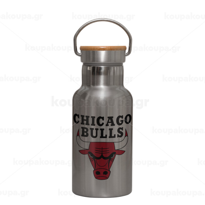 Chicago Bulls, Μεταλλικό παγούρι θερμός (Stainless steel) Ασημένιο με ξύλινο καπακι (bamboo), διπλού τοιχώματος, 350ml