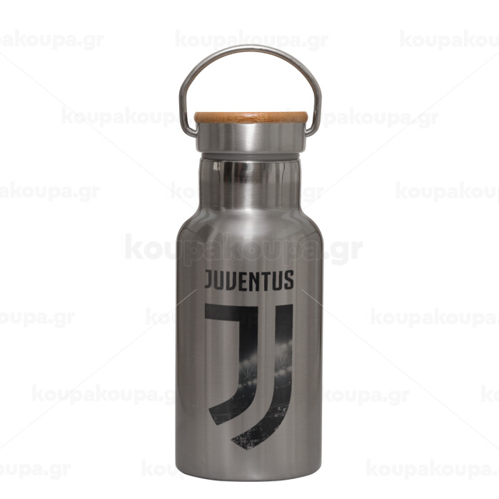FC Juventus, Μεταλλικό παγούρι θερμός (Stainless steel) Ασημένιο με ξύλινο καπακι (bamboo), διπλού τοιχώματος, 350ml
