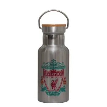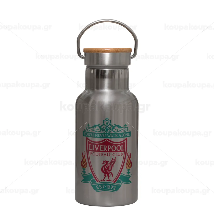 Liverpool, Μεταλλικό παγούρι θερμός (Stainless steel) Ασημένιο με ξύλινο καπακι (bamboo), διπλού τοιχώματος, 350ml