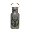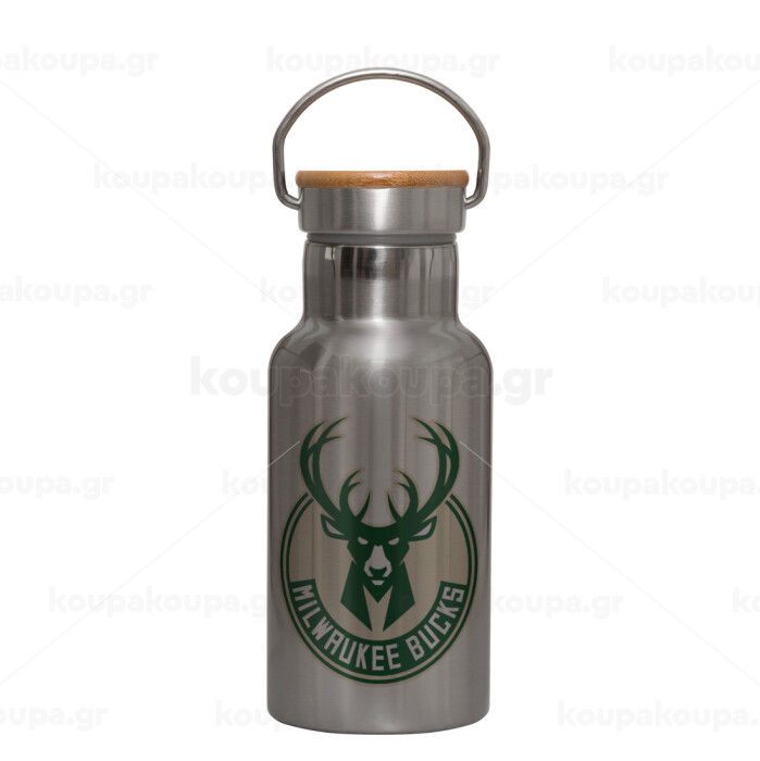 Milwaukee bucks, Μεταλλικό παγούρι θερμός (Stainless steel) Ασημένιο με ξύλινο καπακι (bamboo), διπλού τοιχώματος, 350ml