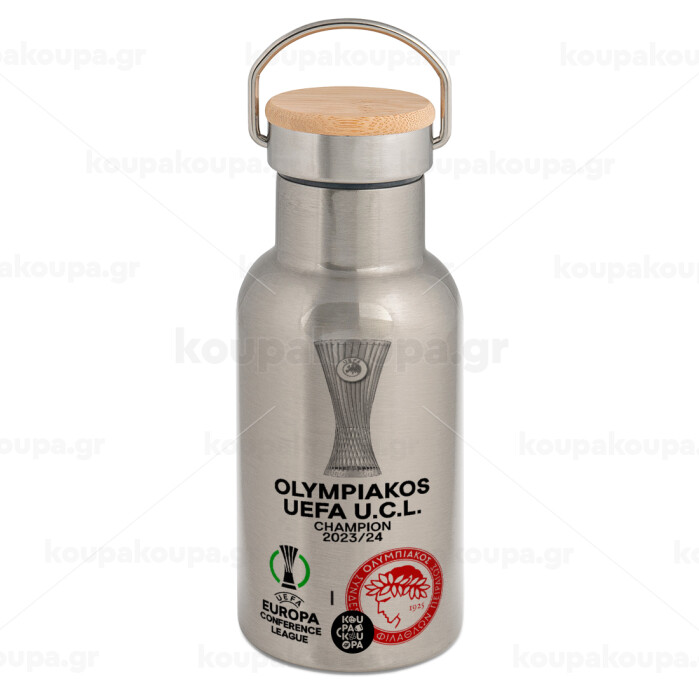 Ολυμπιακός νικητής UEFA Europa Conference League Champion 2023/24, Μεταλλικό παγούρι θερμός (Stainless steel) Ασημένιο με ξύλινο καπακι (bamboo), διπλού τοιχώματος, 350ml