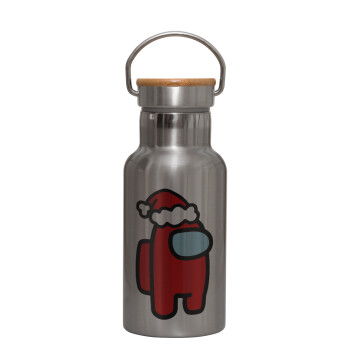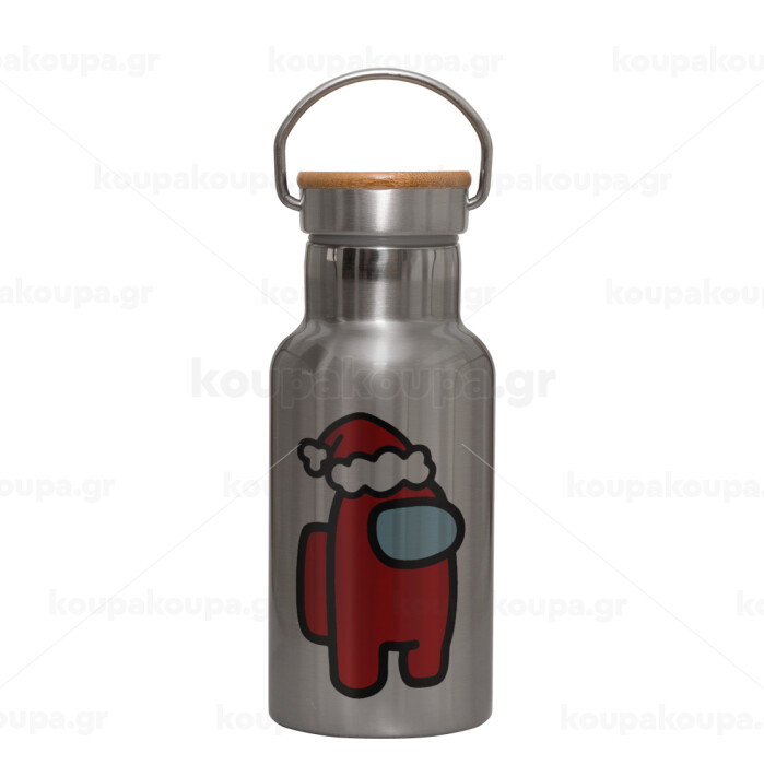 Among US Santa, Μεταλλικό παγούρι θερμός (Stainless steel) Ασημένιο με ξύλινο καπακι (bamboo), διπλού τοιχώματος, 350ml
