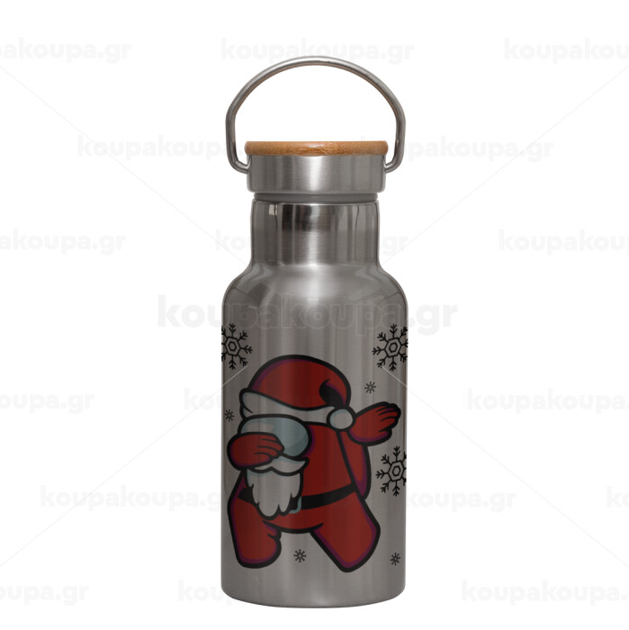 Among US Xmas, Μεταλλικό παγούρι θερμός (Stainless steel) Ασημένιο με ξύλινο καπακι (bamboo), διπλού τοιχώματος, 350ml