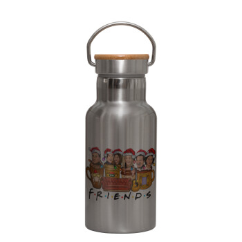 FRIENDS xmas, Μεταλλικό παγούρι θερμός (Stainless steel) Ασημένιο με ξύλινο καπακι (bamboo), διπλού τοιχώματος, 350ml