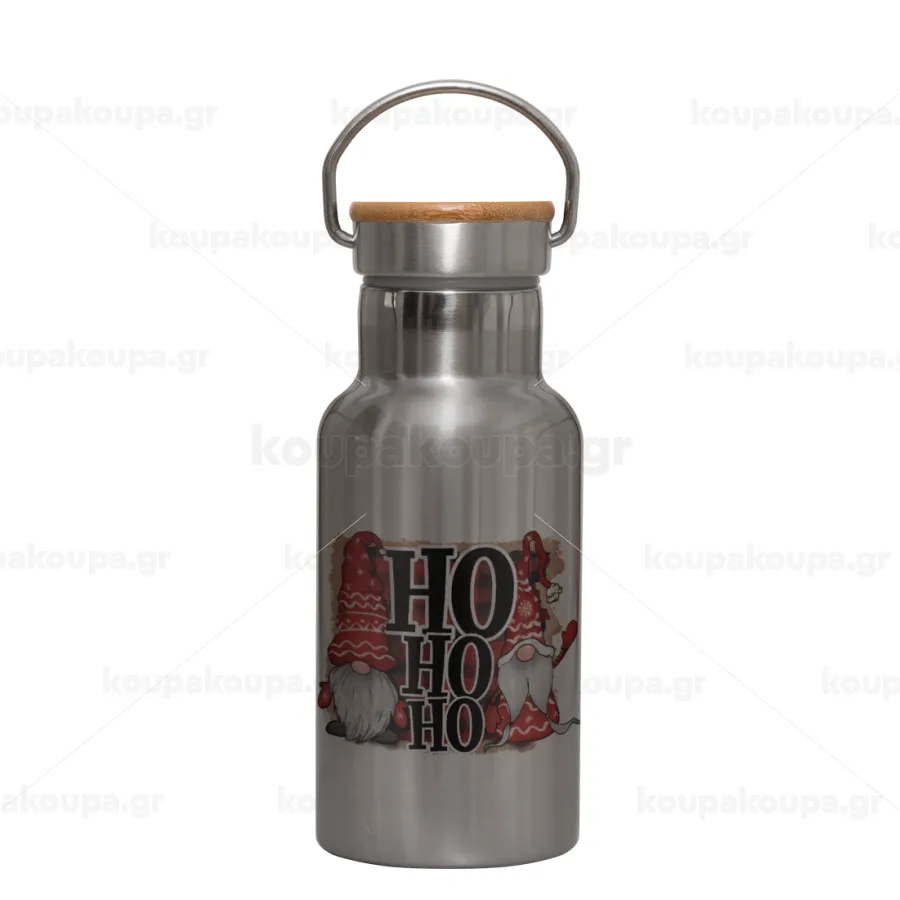 Ho ho ho, Μεταλλικό παγούρι θερμός (Stainless steel) Ασημένιο με ξύλινο καπακι (bamboo), διπλού τοιχώματος, 350ml