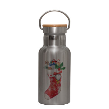 Xmas boot, Μεταλλικό παγούρι θερμός (Stainless steel) Ασημένιο με ξύλινο καπακι (bamboo), διπλού τοιχώματος, 350ml