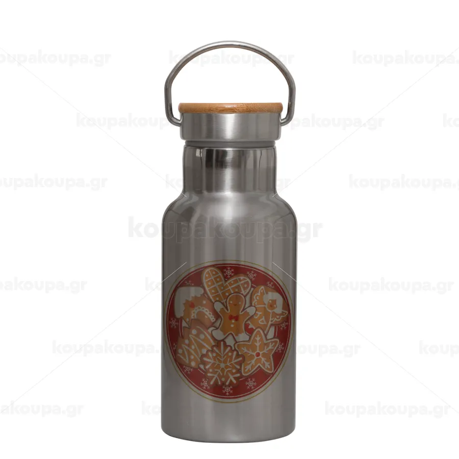 xmas cookies, Μεταλλικό παγούρι θερμός (Stainless steel) Ασημένιο με ξύλινο καπακι (bamboo), διπλού τοιχώματος, 350ml