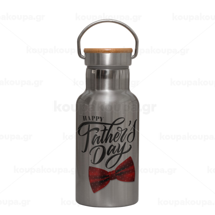 Happy father's Days, Μεταλλικό παγούρι θερμός (Stainless steel) Ασημένιο με ξύλινο καπακι (bamboo), διπλού τοιχώματος, 350ml