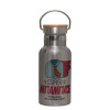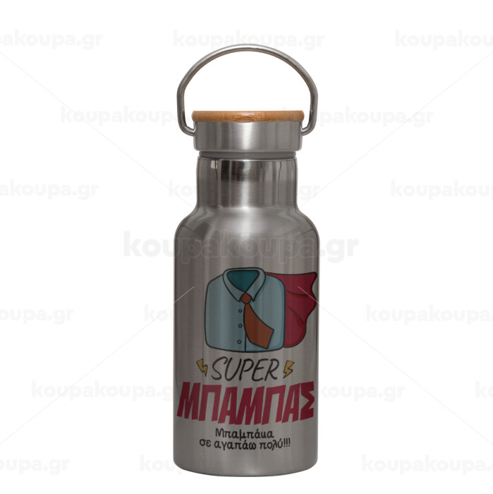 SUPER ΜΠΑΜΠΑΣ, Μεταλλικό παγούρι θερμός (Stainless steel) Ασημένιο με ξύλινο καπακι (bamboo), διπλού τοιχώματος, 350ml