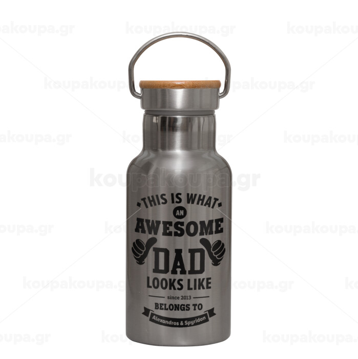 This is what an Awesome DAD looks like, Μεταλλικό παγούρι θερμός (Stainless steel) Ασημένιο με ξύλινο καπακι (bamboo), διπλού τοιχώματος, 350ml