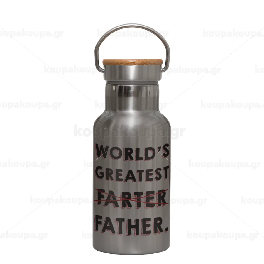 World's greatest farter, Μεταλλικό παγούρι θερμός (Stainless steel) Ασημένιο με ξύλινο καπακι (bamboo), διπλού τοιχώματος, 350ml