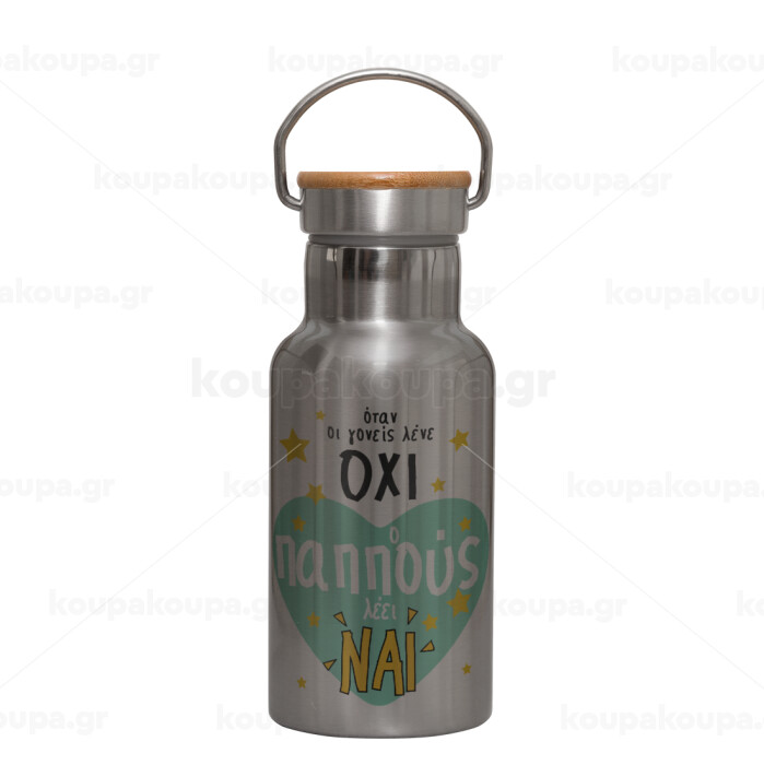 Όταν οι γονείς λένε ΟΧΙ, ο παππούς λέει ΝΑΙ, Μεταλλικό παγούρι θερμός (Stainless steel) Ασημένιο με ξύλινο καπακι (bamboo), διπλού τοιχώματος, 350ml