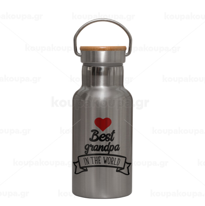 Best Grandpa in the world, Μεταλλικό παγούρι θερμός (Stainless steel) Ασημένιο με ξύλινο καπακι (bamboo), διπλού τοιχώματος, 350ml