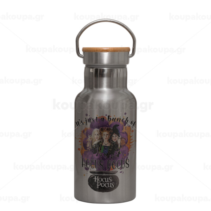 Hocus Pocus, Μεταλλικό παγούρι θερμός (Stainless steel) Ασημένιο με ξύλινο καπακι (bamboo), διπλού τοιχώματος, 350ml