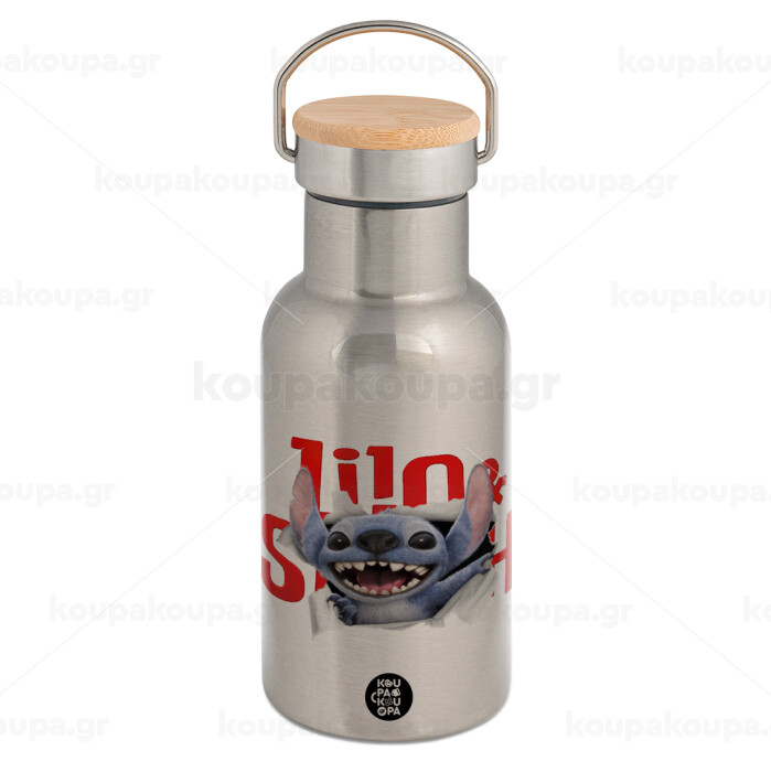 Stitch movie, Μεταλλικό παγούρι θερμός (Stainless steel) Ασημένιο με ξύλινο καπακι (bamboo), διπλού τοιχώματος, 350ml