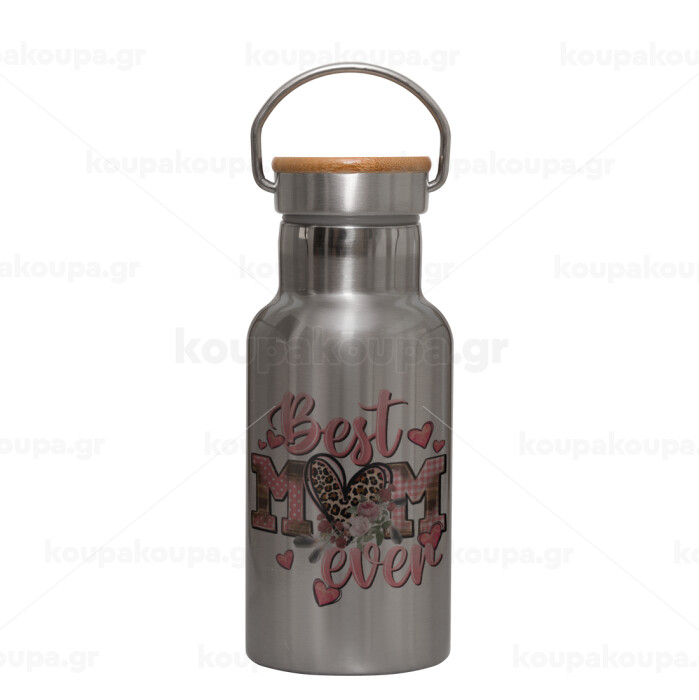 Best mom ever Mother's Day, Μεταλλικό παγούρι θερμός (Stainless steel) Ασημένιο με ξύλινο καπακι (bamboo), διπλού τοιχώματος, 350ml